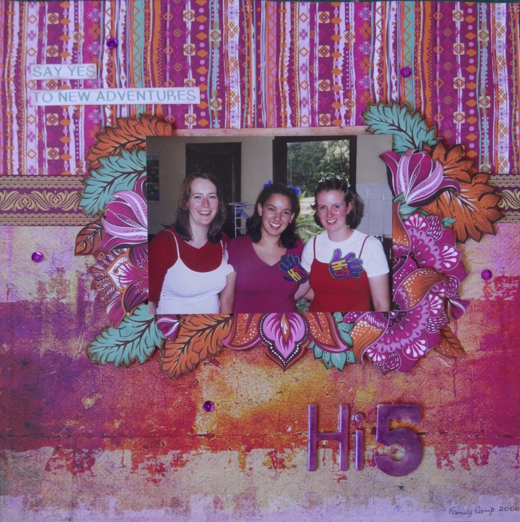 This layout of my daughter and two of her friends is for Off the Rails April Colour challenge….photo taken at a church family camp where they dressed up as Hi 5 in 2000.