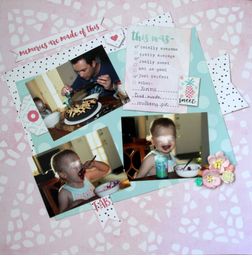 Layout for Off the Rails September challenge all about food. Both my sons are great cooks and this layout is about the mulberry pie one of our sons made which we all got to enjoy. He took cuttings from my parents mulberry tree in Adelaide in 2006..these mulberries are from that….My parents have passed away now and the tree is gone too so its a very special pie.